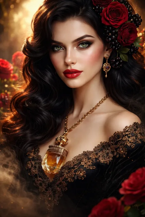 A stunning hyper-realistic close-up portrait of a sophisticated 19th-century aristocratic lady embodying the essence of Frederic Malle Portrait of a Lady perfume. She has porcelain skin glowing with a subtle golden radiance, piercing deep emerald eyes framed by long dark lashes, full crimson lips curved in a mysterious enigmatic smile. Her voluminous raven-black hair cascades in elegant waves adorned with fresh blooming crimson roses and delicate blackcurrant berries, releasing an aura of rich Turkish rose, patchouli, and incense notes. She wears a luxurious black velvet gown with intricate gold lace details, a single antique crystal perfume flacon dangling from a golden chain necklace, engraved with "Portrait of a Lady". Dramatic cinematic lighting with soft god rays filtering through a misty rose garden at golden hour, bokeh background of blooming Damascus roses and swirling perfume mist in deep burgundy, black, and amber tones. Ultra-detailed, photorealistic, 8K resolution, award-winning fashion photography style by Mario Testino and Tim Walker, luxurious opulent atmosphere, high contrast, sharp focus on face and perfume elements.