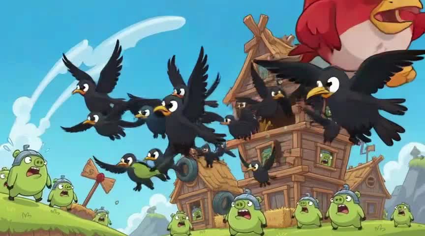 Видео в стиле мультика Angry Birds показывает, как мультяшная деревня превращается в поле боя: стая черных птиц пикирует с высоты, а дома со соломенными крышами разлетаются на щепки. В основе результата - промпт с кинематографическим аэроснимком и драматическим освещением, которое усиливает напряжение в кадре.