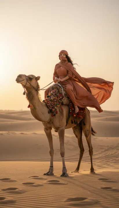 Молодая девушка едет верхом на верблюде в пустыни через золотые барханы - фотореалистичная сцена путешествия: восточный платок закрывает нижнюю часть лица, а выразительные зеленые глаза становятся главным акцентом кадра. Терракотовое платье из легкой ткани и развевающаяся накидка подчеркивают движение ветра и масштаб пространства.