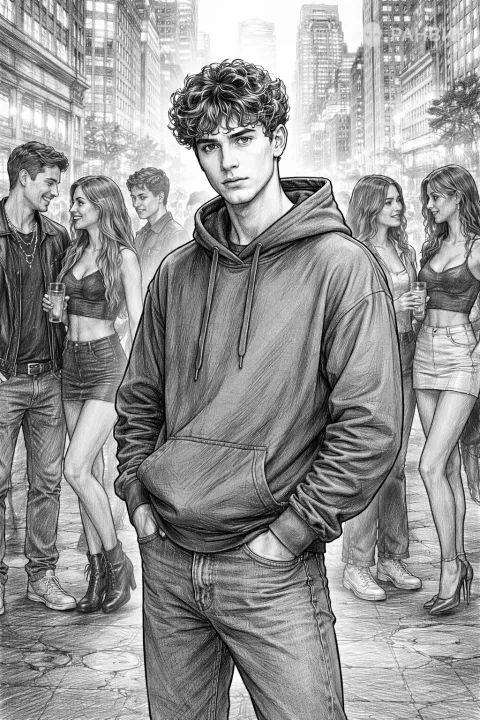 Рисунок парня в кофте среди людей передает настроение большого города: молодой парень с кудрявыми короткими волосами и серьезным взглядом стоит на фоне мегаполиса, где рядом гуляют нарядные девушки и парни. Контраст спокойной позы и шумной компании делает сцену живой и психологичной.