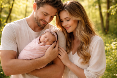 Семейный портрет «счастливая семья» передает теплую прогулку родителей с новорожденной дочкой среди весенней зелени. Кадр построен на мягком солнечном свете: он подсвечивает кожу и волосы, делает тени деликатными и усиливает ощущение близости.