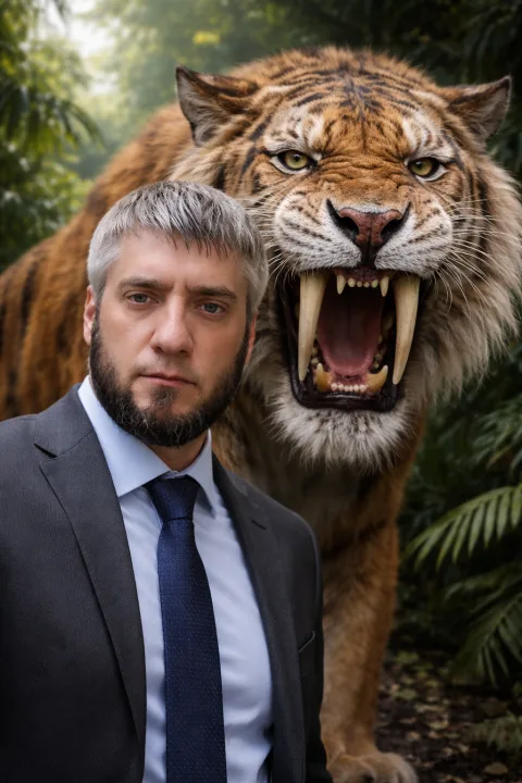 Селфи с тигром сразу задает напряжение: мужчина в офисной одежде оказывается лицом к лицу с крупным саблезубым хищником. Контраст строгого костюма и первобытной мощи зверя делает кадр цепляющим и запоминающимся.