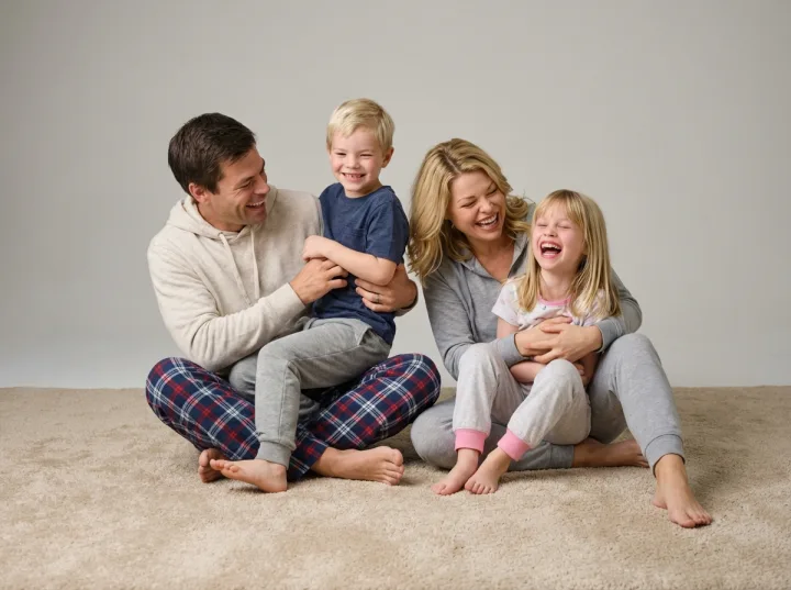 Соберите теплые кадры, где семья в домашней одежде играет и смеется на сплошном однотонном ковре, а однотонный студийный фон не отвлекает от эмоций. Равномерное профессиональное студийное освещение делает кожу мягкой, а детали одежды и мимики читаются чисто и аккуратно.