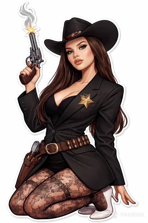 Стикер девушки в образе шерифа с револьвером создан как яркая иллюстрация для мессенджеров, витрин и упаковки. В основе промпт с акцентом на чистый белый фон и гладкий цифровой арт: изображение читается мгновенно, а высокая детализация и яркие контуры сохраняют выразительность даже в небольшом размере.