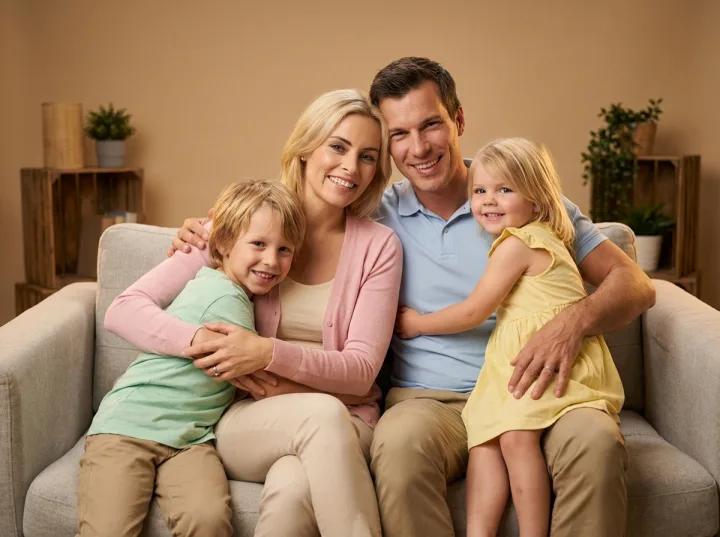 Промпт для студийного семейного фото помогает собрать живую сцену: семья на диване, объятия, спокойная домашняя поза и искренние улыбки. Пастельная повседневная одежда снижает контраст и делает кадр мягким, а нейтральный фон не отвлекает от эмоций.