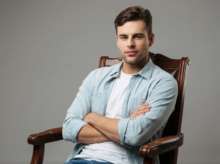 Промпт для студийной фотографии помогает получить выразительный классический портрет: мужчина в рубашке повседневного стиля, скрещенные руки, дорогой деревянный стул с подлокотниками и минималистичный серый фон. Нейтральные тона удерживают внимание на лице и позе, а строгая композиция подходит для портфолио, делового профиля и рекламных задач.