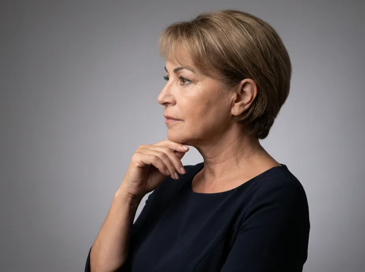 Промпт для создания студийного портрета помогает собрать строгий, выразительный профиль: рука у подбородка задает линию мысли, а классическое платье усиливает ощущение статуса и спокойствия.