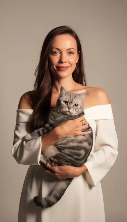 Мягкое рассеянное освещение и нейтральный светлый фон студии дают ровный тон кожи и аккуратные тени без лишней резкости. Высокая детализация подчеркивает текстуру шерсти британского кота и гладкость ткани белого платья с открытыми плечами.