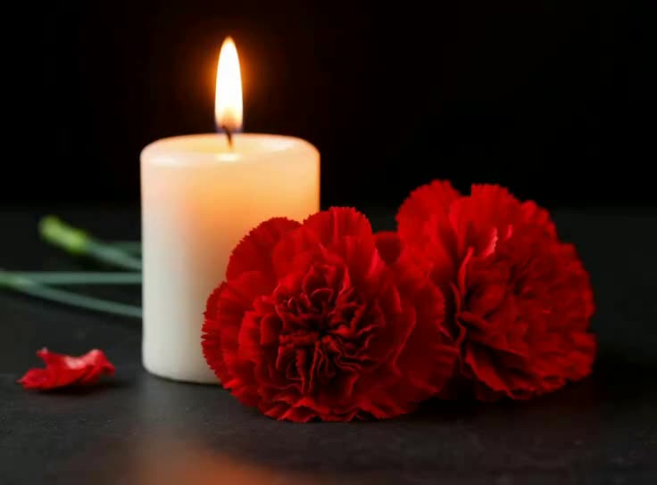 Траурная картинка со свечами и гвоздиками на черном фоне передает тишину памяти через минимализм: белая свеча с теплым пламенем и две красные гвоздики на глубоком черном фоне. Мягкий свет и глубокие тени создают сдержанную, уважительную атмосферу, а крупный план и высокая детализация помогают сохранить выразительность без лишних акцентов.