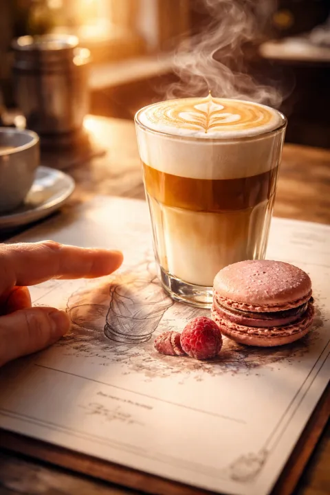 The scene opens on a pristine white page of an elegant coffee shop menu, softly illuminated by warm morning sunlight streaming through the café windows and steam from a freshly brewed espresso. In the center of the page is a detailed black-and-white pencil sketch: a tall glass of latte macchiato with perfectly layered milk foam, a shot of espresso, and an intricate leaf of latte art on the surface, with a delicate raspberry macaron featuring a ridged chocolate shell placed beside it.