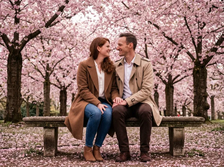 Создайте композицию вокруг трех опор: локация с сакурой, взаимодействие пары и свет без жестких теней. Добавьте детали одежды и позы на скамейке, чтобы получить цельную историю, а не случайный портрет.