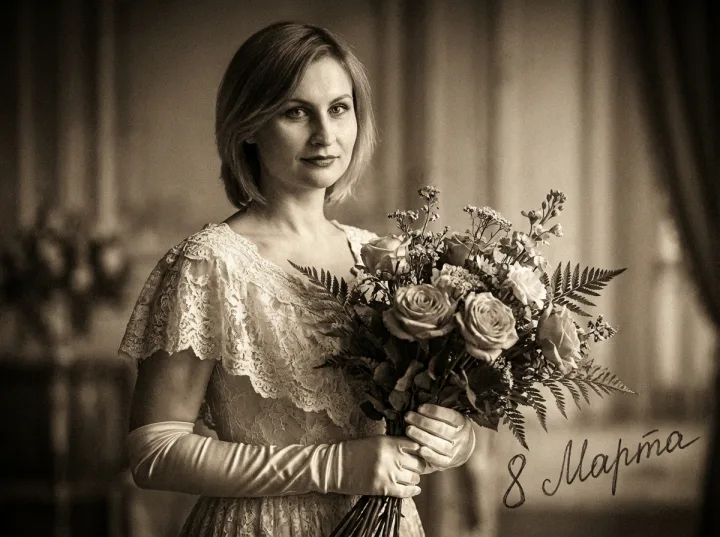 Винтажное фото женщины на 8 марта - выразительный образ для открытки, афиши или оформления поздравления, где важны такт, стиль и теплая эмоция без лишних слов. Сепия, виньетка и заметная зернистость создают ощущение старой фотокарточки, а рукописная надпись «8 Марта» усиливает атмосферу праздника.