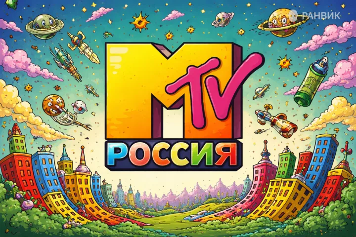 Заставка MTV Россия в стиле 90-х - яркая психоделическая иллюстрация с мощной ретро-энергией: огромный желтый объемный логотип в центре, глянцевая подпись «Россия» и ощущение постоянного движения.