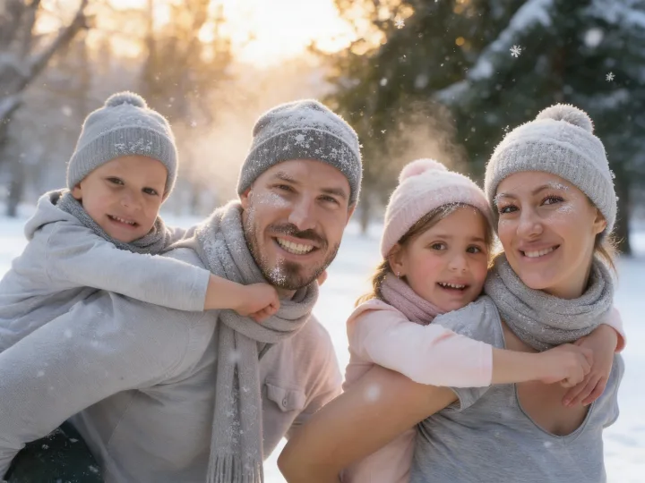 Зимнее фото крупным планом раскрывает потенциал генеративного изображения как инструмента точной визуальной передачи эмоций и среды. В центре композиции - лица семьи, снятые с малой глубиной резкости, что усиливает эффект присутствия и концентрирует внимание на мимике и взглядах детей и родителей.