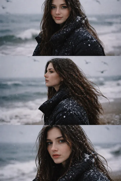 Фотосессия молодой девушки на фоне зимнего моря передает атмосферу холодного побережья: серо-синее море, ветер, снег в движении и чайки в небе. Вертикальный коллаж из трех горизонтальных кадров собирает историю от мягкой улыбки до задумчивого взгляда, сохраняя цельность образа без рамок и лишних деталей.